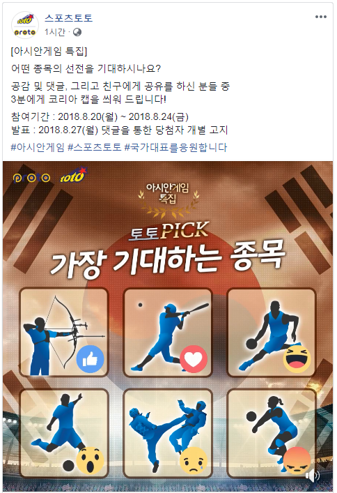 아시안게임 특집 이벤트는 스포츠토토 페이스북 이벤트 페이지를 방문해 농구, 배구, 야구, 축구, 태권도, 양궁 등 이번 아시안게임에서 선전할 것으로 기대되는 종목을 예상해 공감 및 댓글, 친구 공유를 완료하면 참여할 수 있다. 이번 이벤트에 참여한 팬들 중 추첨을 통해 선발된 3명에게는 코리아 캡을 증정한다.