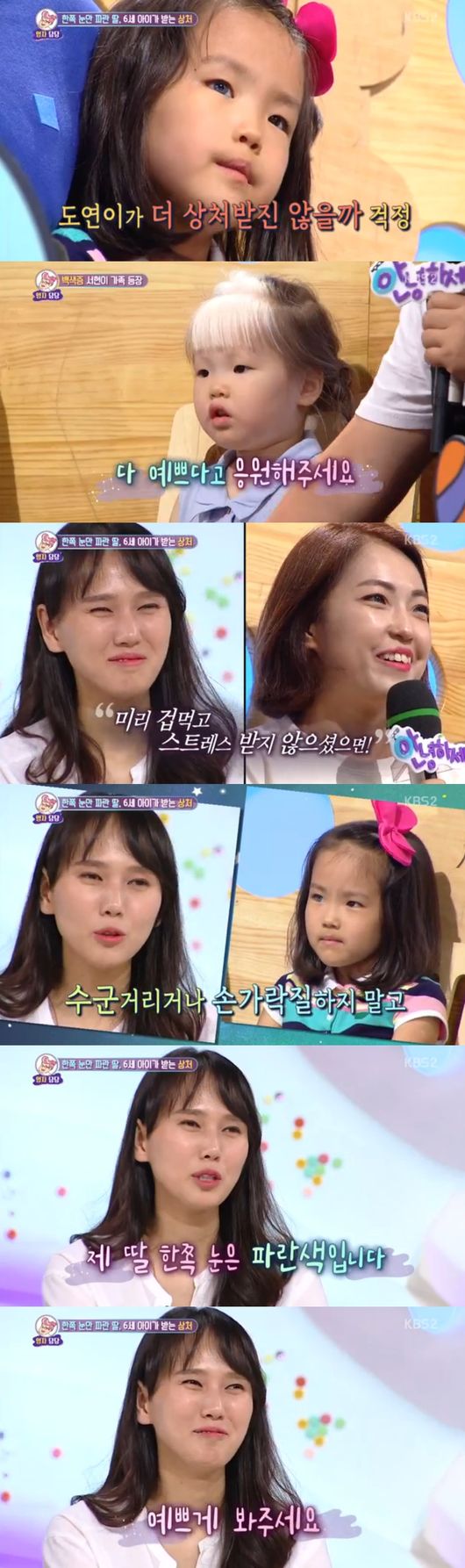 또한 딸이 검은색 눈을 가지고 싶어 울먹였단 말을 전하며 사연의 母는 결국 눈물을 흘렸다. 어린나이에 받았을 상처에 모두가 눈물을 흘렸다. 이어 딸의 사진이 공개됐다. 눈의 보석과 바다를 담은 신비롭고 매력적인 눈을 가진 아이였다. 주인공인 딸 도연이 직접 출연했다. 아이는 모두의 걱정과 달리 "내 얼굴 중 눈이 가장 예쁘다"면서 긍정적인 모습을 보였다.