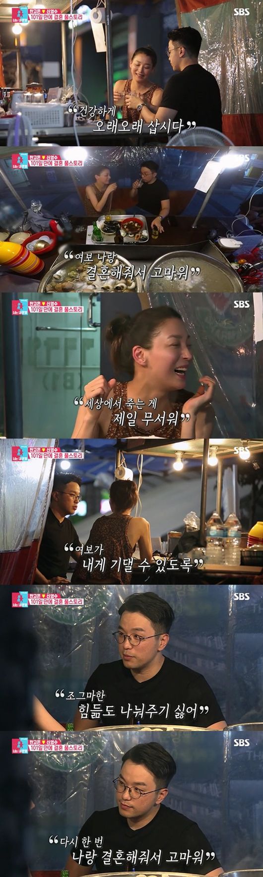 두 사람은 포장마차에서 함께 술잔을 기울이며 이런 저런 이야기를 나눴다. 한고은은 한 번도 물어본 적 없다며 “언제 나랑 결혼할 결심을 했냐”고 물었고, 뜻밖에도 남편 신영수는 “만나기 전에 문자를 나눌 때부터”라고 답해 한고은을 놀라게 했다. 이들은 한고은이 신영수를 종업원으로 착각했던 첫 만남을 떠올리며 함께 웃었다.