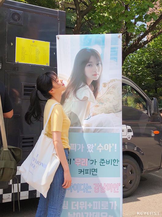 또한 조우리는 자신의 캐릭터 이름을 활용해 “커피가 왔’수아’”, “우리 ‘우리’가 준비한 커피면 ‘내 아이디는 강남미인’ 팀 더위+피로가 날아간데요!” 등 센스 있는 현수막 문구 아이디어로 작품에 대한 애정을 담아내기도.