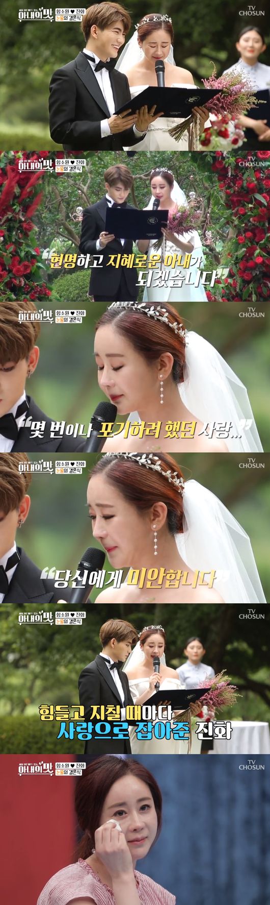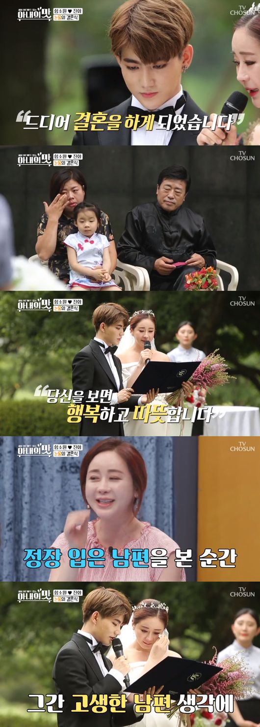 상견례를 마치고 드디어 함소원과 진화가 결혼식을 올렸다. 꿈에 그리던 결혼식에 함소원은 끝내 눈물을 보였다. 함소원이 진화에게 쓴 편지를 읽다 운 것. 그는 “처음 본 그날부터 당신을 마음에 품었다. 우리에게 닥친 시련, 당신과의 사랑을 포기하려 했던 것이 미안하다. 그때마다 사랑으로 잡아준 남편에게 고맙다”고 마음을 전했다.