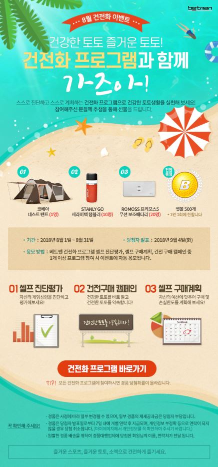 위 세 가지 건전화 프로그램 중 1개 이상에 참여할 경우 이번 이벤트에 자동으로 응모되며, 추첨을 통해 코베아 네스트 텐트(1명), STANLY GO 세라미백 텀블러(10명), ROMOSS 프리모스5 무선 보조베터리(20명)를 증정한다. 또한 참여자 전원에게는 1인 1회에 한해 베트맨 사이트 내의 다양한 경품 응모가 가능한 뱃볼 500개를 지급한다.