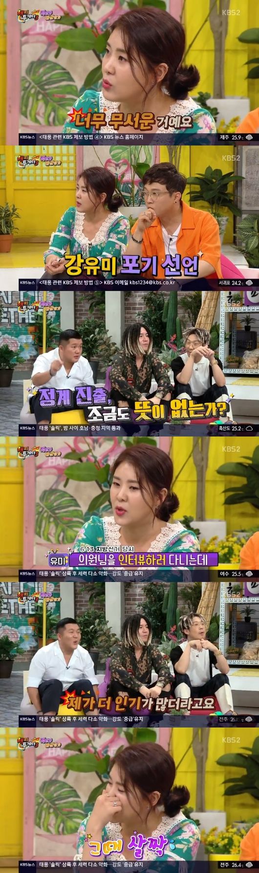 또, 강유미는 "정치 관련 이슈 인물을 찾아다니고 하면서 정계진출 계획이 생기지 않았냐?"는 질문에 "전혀 없다. 사실 공천 받는 거 아니냐고 하는데 깊이 들어가면 안 된다"며 부인했다. 그러나 "지방선거 때 의원님들 인터뷰를 하러 다니는데 내가 더 인기가 많더라. 그때 살짝 욕심났다"며 미소를 보였다.