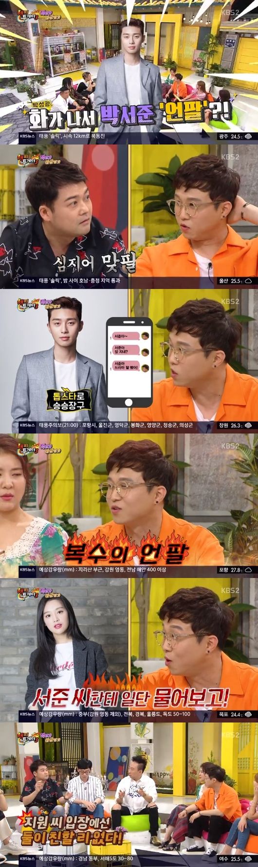 최근 '전지적 참견 시점'을 통해 인기가 높아진 박성광은 자신보다 더 유명해진 매니저 송이 양을 언급했다. 박성광은 "(회사) 회의 안건이 박성광 키우는 것보다 송이 키우는 게 더 빠르겠다는 말이 나온다"고 말해 웃음을 안겼다.