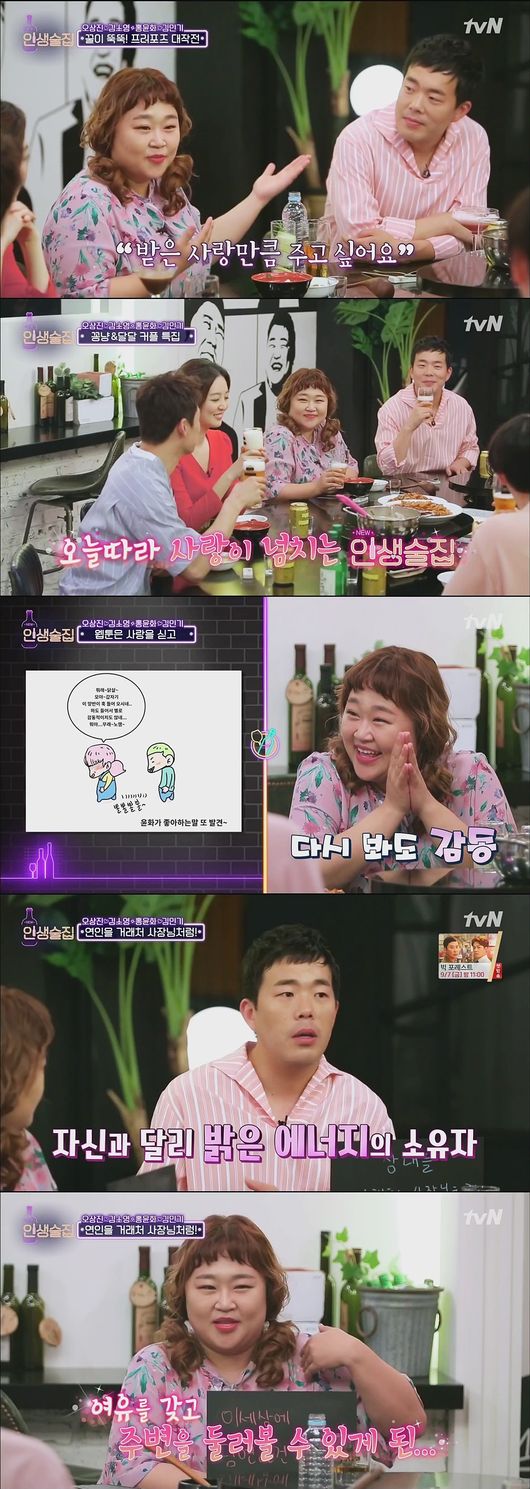 지난 23일 방송된 tvN 예능 ‘인생술집’에서는 홍윤화, 김민기와 오상진, 김소영 등 연예계 대표 사랑꾼들이 모여 알콩달콩한 에피소드 및 시련 극복 이야기를 들려줘 행복 바이러스를 전파했다.