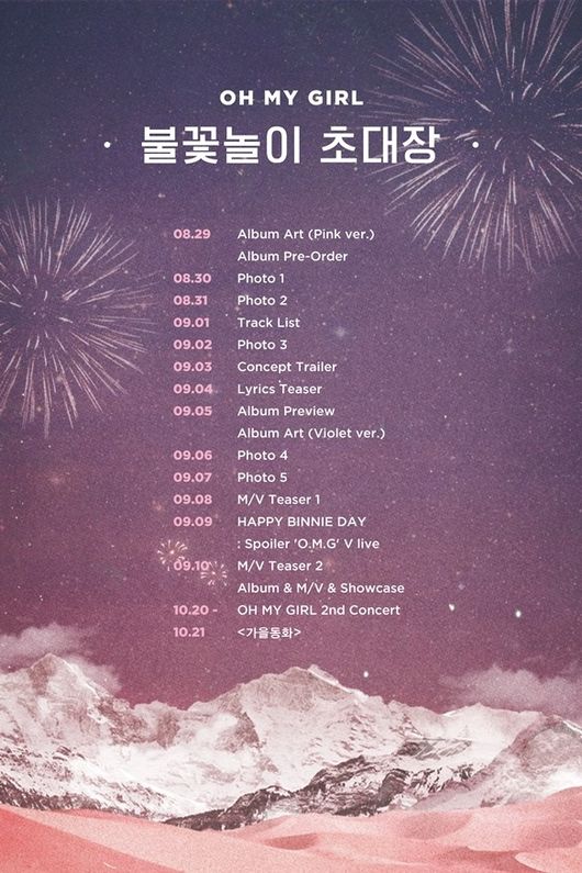 오마이걸은 24일 0시 소속사 WM엔터테인먼트의 공식 SNS채널을 통해 “OH MY GIRL 6th Mini Album [Remember me] '불꽃놀이' 초대장 Coming Soon 2018.09.10. #OHMYGIRL #오마이걸 #OMG #불꽃놀이”라는 글과 함께 컴백 프로모션을 알리는 티저 이미지를 오픈했다.