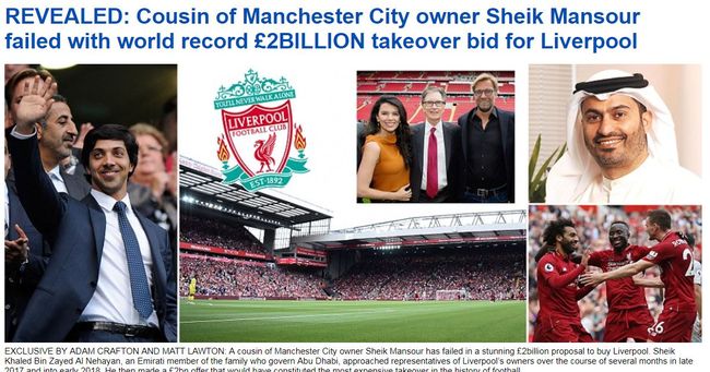 영국 데일리메일은 24일(이하 한국시간) "맨체스터시티 구단주 셰이크 만수르의 사촌 셰이크 칼레드 빈 자이드 알 네하얀이 리버풀 구단을 인수하려고 20억 파운드를 제안했다. 2017년 말부터 올해 초까지 몇 개월 동안 리버풀 구단과 협상을 했으나 리버풀 톰 워너 회장이 거절했다"고 전했다.
