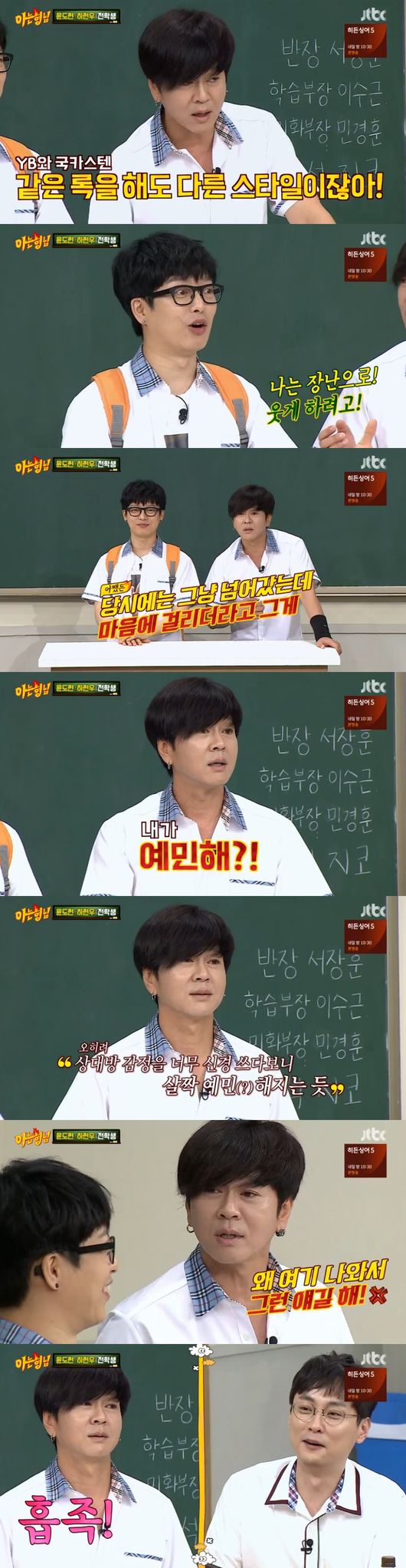 이에 하현우는 "약간 미안한 것이 있었다"면서 "사실 형이 쿨한 뮤지션인 줄 알았는데 굉장히 예민했다"고 폭로했다. 같이 콘서트 회의를 하던 중, YB 밴드가 하고 싶어하는 걸 국카스텐도 똑같이 한다고 장난 쳤다고. 이에 며칠 뒤 연락이 와서 진지하게 다른 스타일로 가야한다고 말했다고 했다. 자신이 한 말을 며칠 동안 마음에 담아뒀다며 예민한 이유를 전했다. 윤도현은 "같은 록도 다른 스타일이 있다, 경쟁구도 아니고 화합으로 가자고 한거다"면서 "서로 다르게 가자고 한건데 내가 예민한거냐"고 발끈해 웃음을 안겼다.