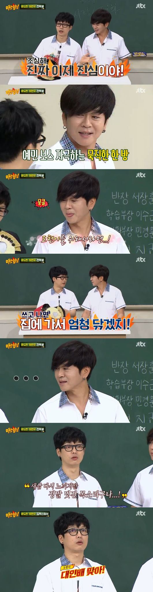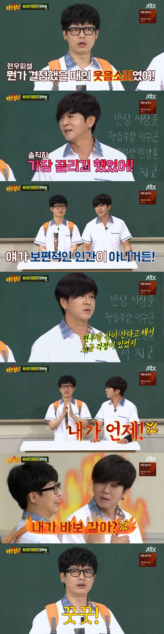 다음은 예능초보인 하현우가 예능을 하면서 깜짝 놀란 이유를 맞히는 것이었다. 알고보니 코 고는 것까지 모두 나갔다고. 무릎까지 꿇고 부탁했으나 전부 방송에 나가 깜짝 놀랐다고 했다. 강호동은 "부탁 안 했으면 편집 됐을 것, 그렇게 찾아가 부탁하니 더 재밌어서 같이 내보낸 것"이라며 예능대부의 조언을 전했다.