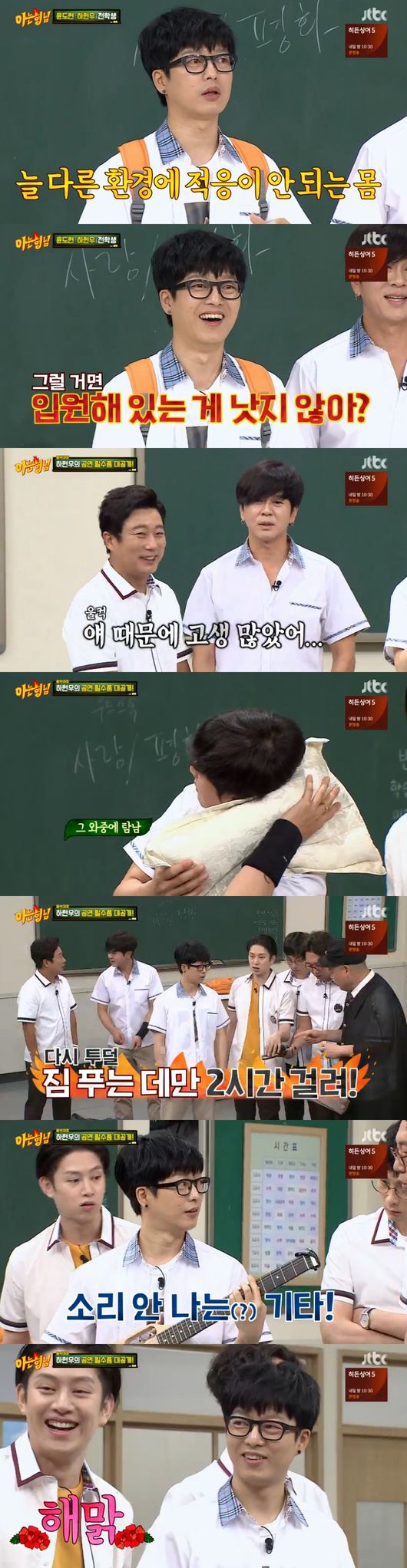 윤도현은 "얘 예민하다"고 해 또 한 번 웃음을 선사했다. 이 뿐만 아니라, 지압신발, 뿌리는 방향제, 샤워기 헤드, 감기대비용 건강음료와 스테레칭 기구가 들어있엇다. 매실 엑기스부터 소리 안나는 기타까지 상상을 뛰어넘는 짐보따리였다. 윤도현은 "짐만 푸는데 2시간 걸린다"면서 "갓난아기다"고 했다. 이수근은 "나까지 예민해지겠다"고 말해 배꼽을 잡았다. 이어 "현우가 나중에 자연인 될 것 같다"고 하자, 하현우는 "내가 유일하게 보는 프로가 '나는 자연인'"이라 받아쳐 또 한번 웃음을 선사했다.