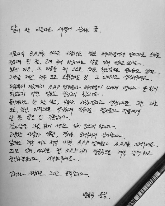 이어 그는 "앞으로도 계속 제가 제일 아끼는 B.A.P 멤버들과 B.A.P를 지켜달라. 언제 어디서든 B.A.P 리더 방용국으로 계속 음악하고 정진하겠다"고 덧붙였다.
