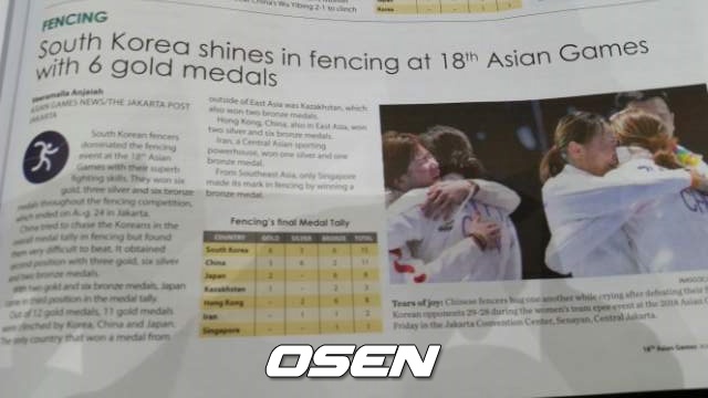 조직위는 26일자 신문을 통해 "한국 펜싱이 아시안게임서 6개의 금메달과 함께 빛났다"고 전했다.