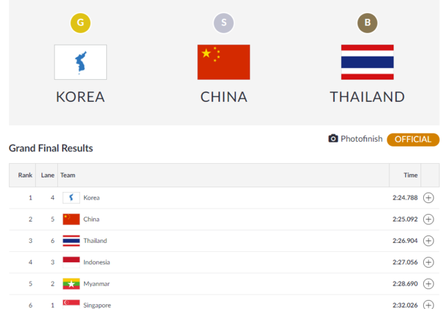 이날 여자 카누팀은 예선과 준결선, 결선 모두 1위를 차지하며 한 수 위의 기량을 과시했다. 단일팀에 이어 중국이 2분 25초 092로 2위, 태국이 2분 26초 904로 3위를 기록했다.