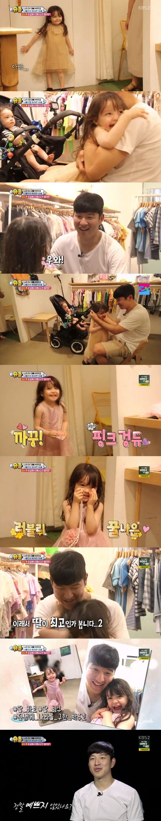 박주호는 나은이에게 옷을 사주기 위해 이동했고, 예쁜 원피스를 선물했다. 드레스를 입은 나은이의 러블리한 모습은 아빠의 마음을 들었다 놨다 했고, "너무 예뻐서 드레스 자주 입히면 안 될 것 같다"며 감탄했다.