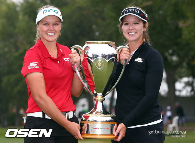 [사진] 브룩 헨더슨이 캐디이자 친언니인 브리타니와 함께 우승컵을 마주 들고 있다. 아래 사진은 박성현의 최종라운드 경기 모습. /ⓒGettyimages(무단전재 및 재배포 금지)