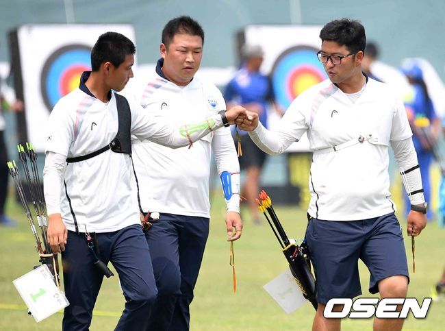 2세트 한국은 김우진이 7점, 이우석이 8점으로 흔들렸으나 '맏형' 오진혁이 10점으로 분위기를 추스렸다. 대만은 첫 3발서 10점-9점-8점을 기록했다.
