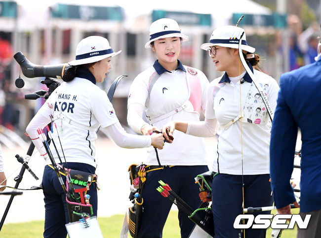 장혜진, 강채영, 이은경은 국민들과의 약속을 지킨 뒤 그제서야 함박미소를 지었다. 특히 장혜진은 극심한 부진을 딛고 2014년 인천 대회에 이어 2회 연속 단체전 금메달을 명중하며 두 배의 기쁨을 누렸다./dolyng@osen.co.kr