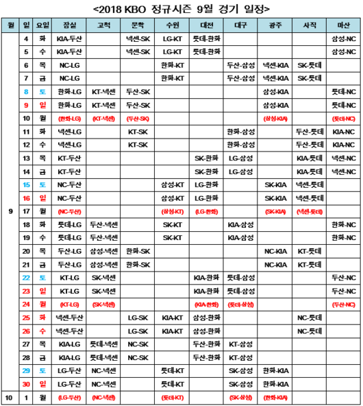KBO는 2018 신한은행 MY CAR KBO 정규시즌 9월 경기에 한해 월요일 예비일을 편성했다.