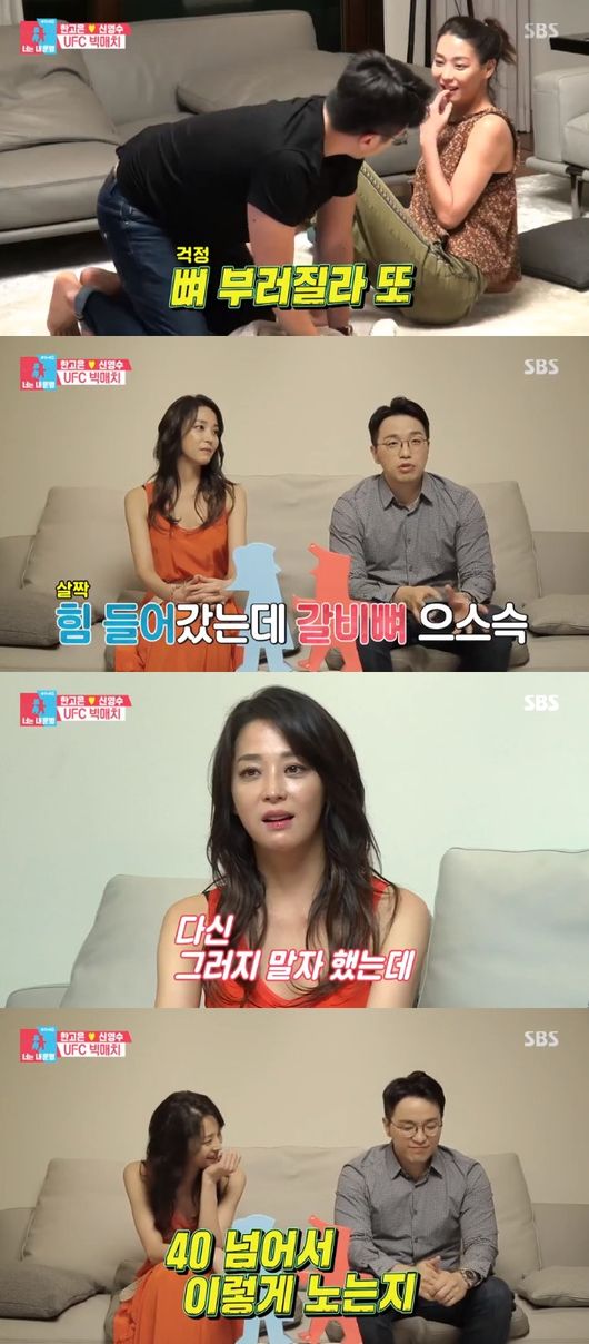 의외의 취미 생활에 모두가 놀라워하는 반면, 두 사람은 소리까지 내지르며 종합격투기 관람에 심취했다. 특히 추성훈이 등장하자 한고은과 신영수는 "너무 멋있다"며 팬심을 드러냈다. 이어 두 사람은 기술을 따라하며 한판 대결을 벌였다. 그 과정에서 신영수는 과거 한고은이 갈비뼈에 금이 간 적이 있다고 고백했다.