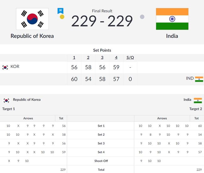 한국은 4엔드까지 인도와 229-229로 동점을 이룬 뒤 3발로 승부를 가리는 슛오프까지 경기에 돌입했다. 두 팀 모두 10점 2발, 9점 1발을 기록했지만 X텐에 좀더 가까운 화살을 쏜 한국이 금메달을 차지했다.