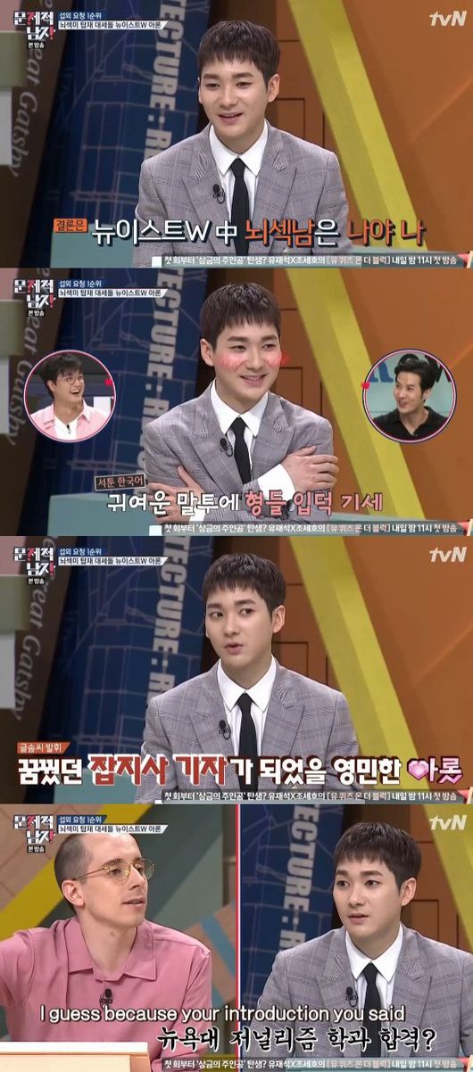 28일 방송된 tvN 예능 '뇌섹시대-문제적 남자'에서는 게스트 섭외 요청 1위에 빛나는 아론이 등장해 활약하는 모습이 전파를 탔다.
