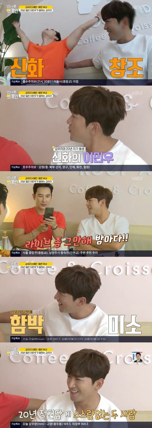 다음은 누군가를 기다렸다. 뷰티 호스트와 마케터 친구들을 만났다. 김우리의 결혼생활을 부러워했다. 이때, 누군가 등장했다. 바로 절친 신화의 이민우였다. 자연스럽게 20년 전 추억을 소환했다. 알고보니 신화 스타일리스로 활동했다고.게다가 가수로 데뷔했었다고 했다. 김우리는 "신화 내 후배다"고 농담하면서 "집에 애가 둘이라고 나 자르면 안 된다고 하면서 일했다"고 말하며 웃었다.