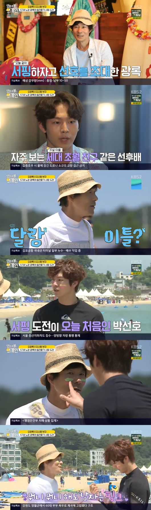 먼저 오광록 오시원 부자 모습이 그려졌다. 강원도 양양에서 영화인 페스티벌에 참석한 오광록은 낭만 스포츠의 대명사인 서핑을 즐기기 위해 바닷가로 나섰다. 57세 노장 광록의 칠전팔기 서핑 도전의 시작을 알렸다. 바다를 보자마자 광록은 감탄을 연발했다.