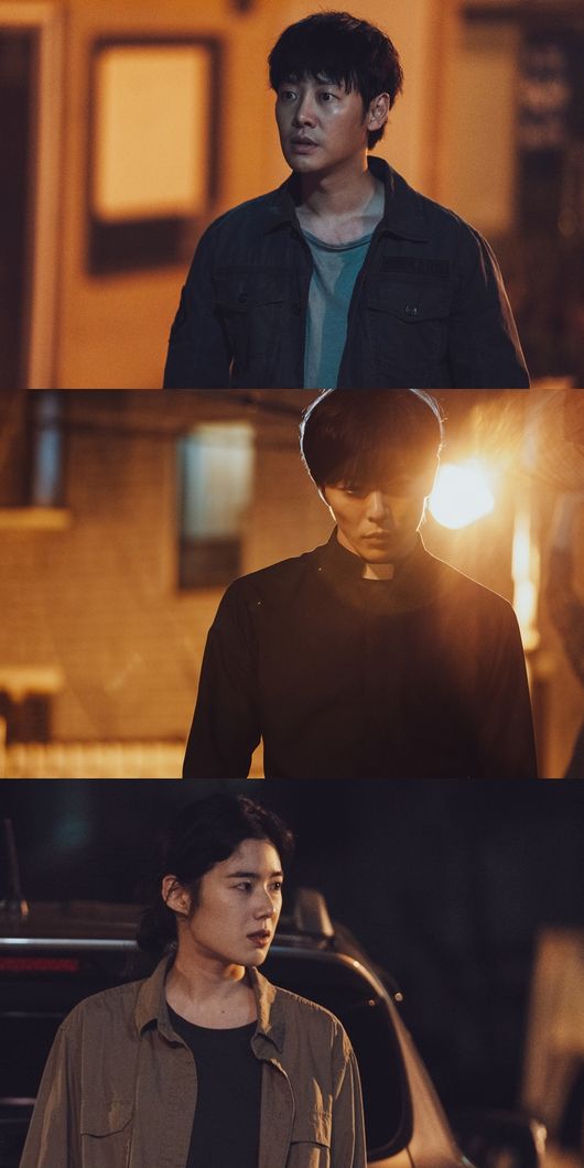 윤화평, 최윤, 강길영의 첫 만남은 그 자체만으로 강렬한 시너지를 선사한다. 악령과 감응하는 자유 영혼 영매 윤화평과 냉정한 엑소시스트 사제 최윤, 악령을 믿지 않는 형사 강길영은 공존하기 어려운 인물. 김동욱의 뜨겁고 폭발적인 눈빛과 김재욱의 차갑고 서늘한 아우라, 정은채의 열정 충만한 에너지가 아주 특별하고 위험한 케미를 발산하며 기대감을 고조시킨다.
