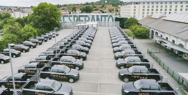 [사진] 지난 7일 인도 마힌드라 연례주주총회에서 공개된 현지형 G4 렉스턴(프로젝트명 Y400, 현지명 미정). 아래 사진은 지난 6월 독일 프랑크푸르트 북동쪽 풀다(Fulda)에서 열린 렉스턴 스포츠(현지명 무쏘)의 독일 론칭 행사장 모습. /쌍용자동차 제공.