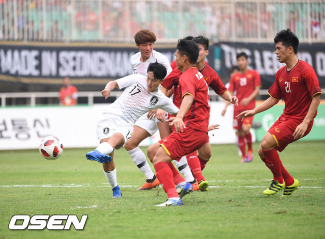 한국은 베트남전에 4-2-3-1을 내세웠다. 와일드 카드 공격수 황의조(감바 오사카)가 원톱, 손흥민(토트넘)이 2선 중앙에 좌우 날개 이승우(헬라스 베로나), 황희찬(잘츠부르크)과 함께 포진했다. 중원은 김정민(리퍼링)과 이진현(포항)이 구축했다. 포백라인은 왼쪽부터 김진야(인천), 김민재(전북), 조유민(수원FC), 김문환(부산)이 형성한다.