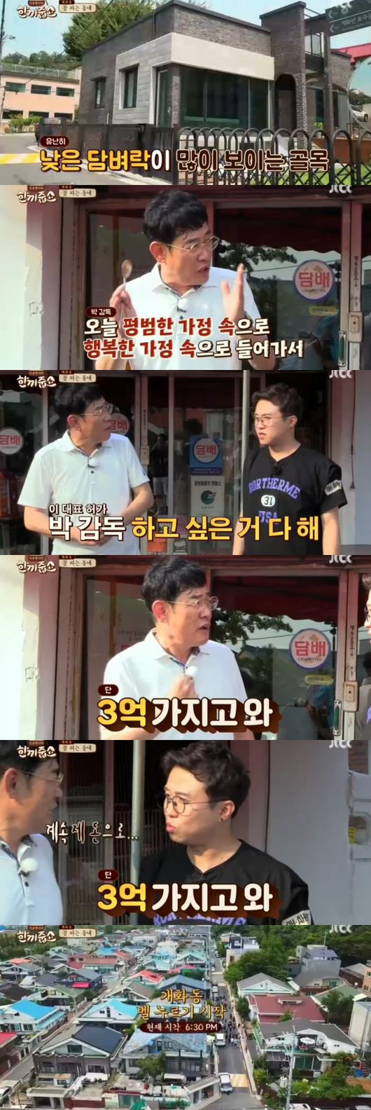 한끼 목적지 개화동에 도착했다. 개화동 주택가와 바로 이어진 강서 둘레길부터 산책을 시작했다. 영화 '워낭소리'를 연상하게 하는 도심 속 진귀한 풍경이었다. 낮은 담벼락이 눈에 띈 개화동 주택가였다. 세월의 멋이 묻어나는 오래된 가옥과 세련된 신식 주택이 어우려져 더욱 인상적이었다. 보면 볼 수록 정겨운 골목들이었다. 박성광은 "영화 촬영지로 너무 좋을 것 같다"며 관심을 보였다. 이경규는 "박감독, 하고 싶은거 다해라"면서 "대신 3억 가지고 와"라고 말하며 제작은 본인의 돈으로 하는 것이라 말해 웃음을 안겼다.
