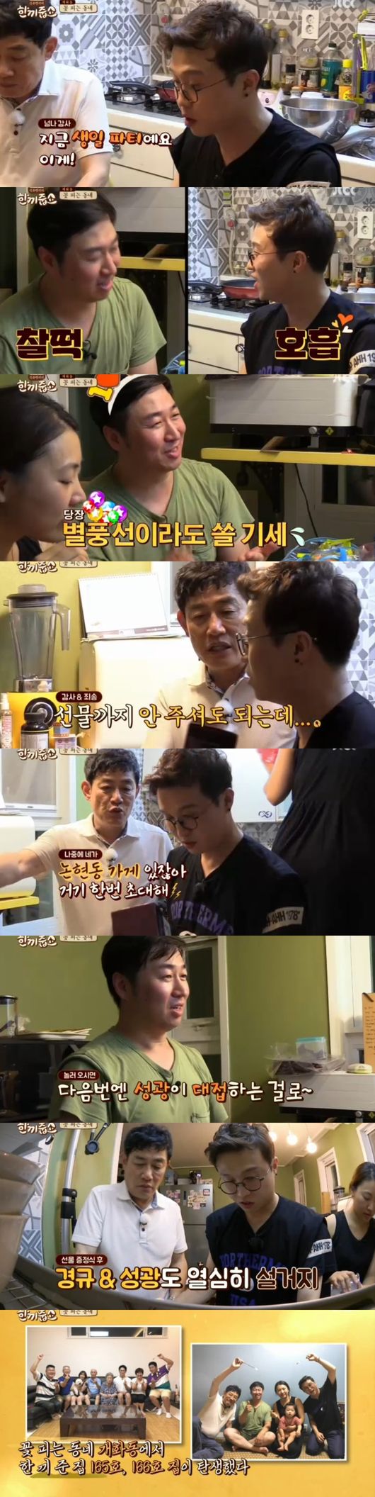 이때, 강아지에게 관심을 보였다. 박성광은 "저희 집 강아지는 광복이"라면서 생일까지 똑같아 인연이 됐다고 했다. 박성광은 "사실 전에 우울증 왔었다, 힘들어하고 하고 있을때 큰 위로가 됐다"며 광복이 덕에 우울증을 극복했다고 해 눈길을 끌었다. 무엇보다 생일을 맞았던 성광은 불운의 연속이었던 하루에서 위로가 되어준 반가운 식구들과의 한끼를 즐겼다. 게다가 집주인은 생일을 맞이한 성광을 위해 생일선물로 위스키를 전달했다. 박성광은 "다음에 논현동에서 대접하겠다"며 감사인사를 전했다. 불운을 행운으로 바꾼 대세남이었다. /ssu0818@osen.co.kr