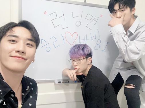 사진 속 승리와 바비와 비아이는 칠판에 글씨를 쓰고 장난스러운 포즈를 취했다.