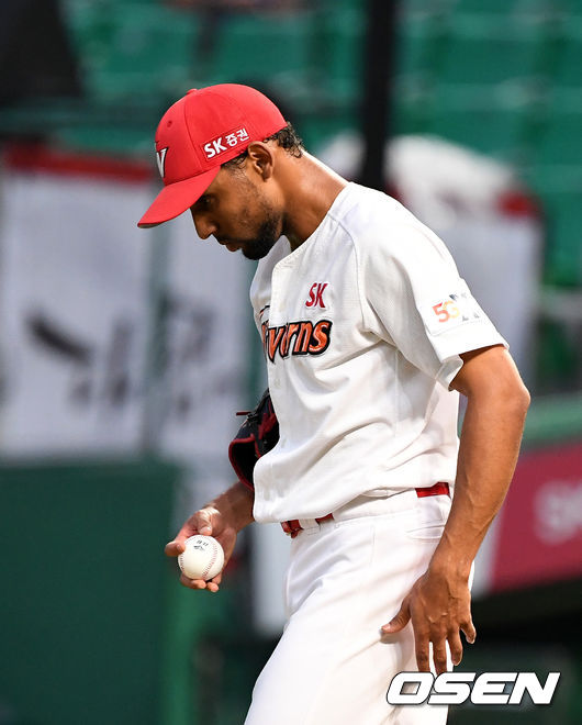 아시안게임 휴식기 직전 극심한 부진에 빠졌던 앙헬 산체스(29·SK)가 리그 재개를 앞두고 실전 점검을 마쳤다. 아직은 커맨드 측면에서 고개가 갸웃거려지는 부분이 있다.
