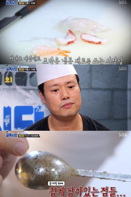 두번째 점검한 초밥집은 상황이 더 나빴다. 백종원의 주문은 모둠 초밥과 알탕. 초밥집 사장은 알탕 뚝배기 그릇을 꺼내 육수가 아닌 수돗물을 붓고 끓이는 모습부터 충격. 음식 만들 물로 손을 씻고 조리용 숟가락에는 녹이 슬었다. 백종원은 "한 번 간을 본 숟가락으로 또 음식 간을 보다니 절대 안된다. 손님이 먹을 음식에 입을 대면 어떻게 하냐"고 황당해 했다.