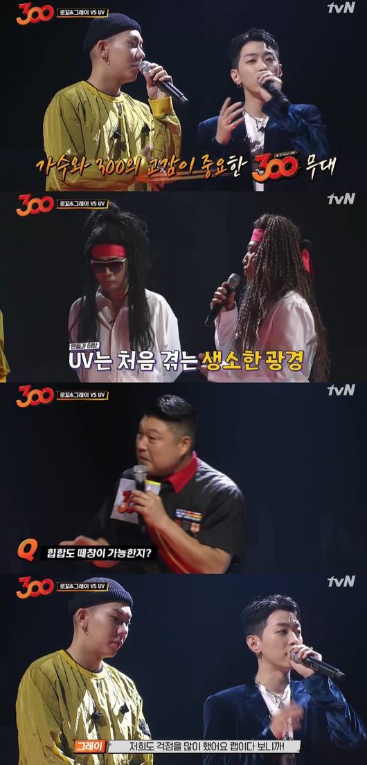 31일 첫 방송된 tvN 새 예능 '300' 1회에서는 로꼬&그레이와 UV가 첫 번째 떼창 대결을 펼치는 모습이 전파를 탔다.