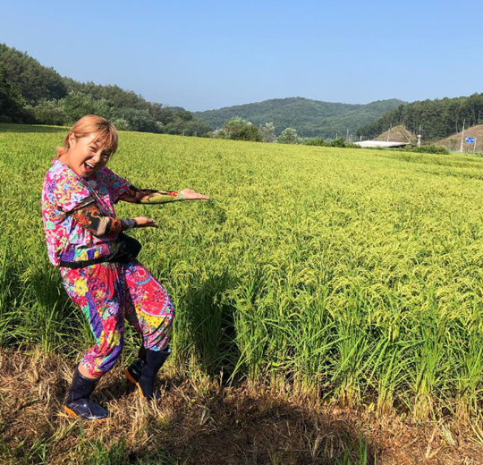사진에는 박나래가 화려한 색감의 일복을 입고 청량감이 넘치는 논을 가리키며 환호하는 표정을 짓고 있는 모습이 담겨져 있다. 박나래의 뒤로는 가을을 상징하는 벼들이 고개를 숙이고 있어 눈길을 모은다.