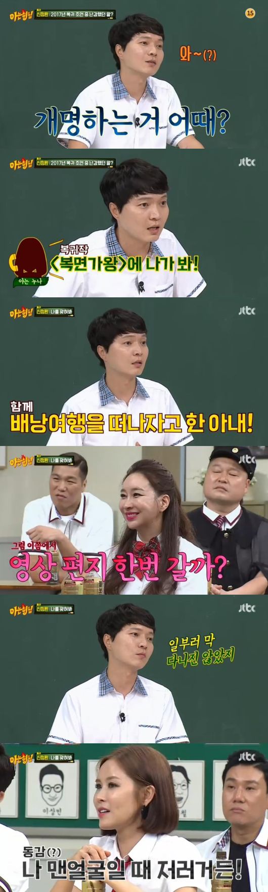 프러포즈에 대해 물었다. 신정환은 "아내가 3개월 월급 모아서 함께 배낭여행 제안했다, 그때 다친 다리가 부어서 힘들었는데, 아내가 휴지통을 비워 온수를 넣더니 다리를 넣어보라고 하더라, 아내도 고단했을 텐데 정말 고마웠다"고 했다.