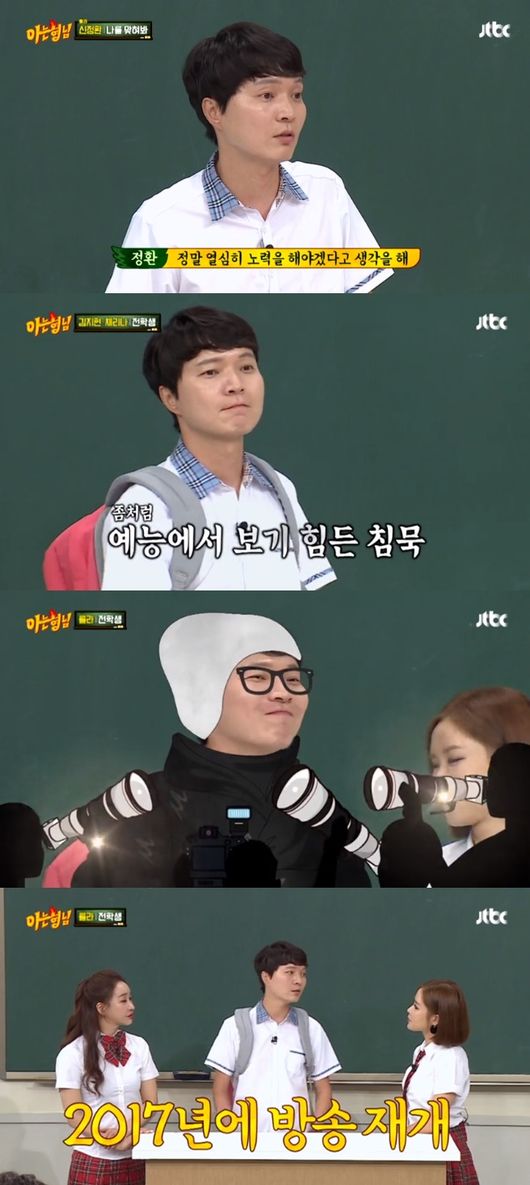 신정환은 1교시 말미 멤버들이 팬들에게 하고 싶은 말이 있느냐는 간단한 질문에 "하지 말아야 될 그런 일을 했기 때문에 내 잘못과 이 빚은 평생 갈 것 같다. 한 순간에 대중들 마음을 돌린다는 생각은 해본 적 없다. 많은 시간을 두고 열심히 살고, 열심히 노력하겠다"는 사과와 다짐을 전했다. 이것이 신정환이 전한 심경 고백의 전부였다.