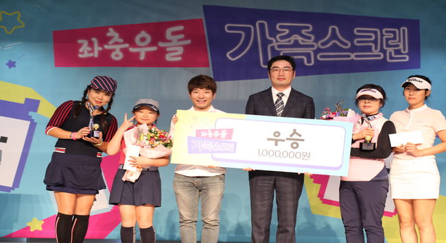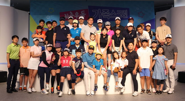 [사진] 왼쪽부터 차민선&박민하 가족, 유튜브 크리에이터 도티, 골프존 김천광 본부장, 김양임&서채영 가족이 우승 기념 촬영을 하고 있다.(아래) /골프존 제공