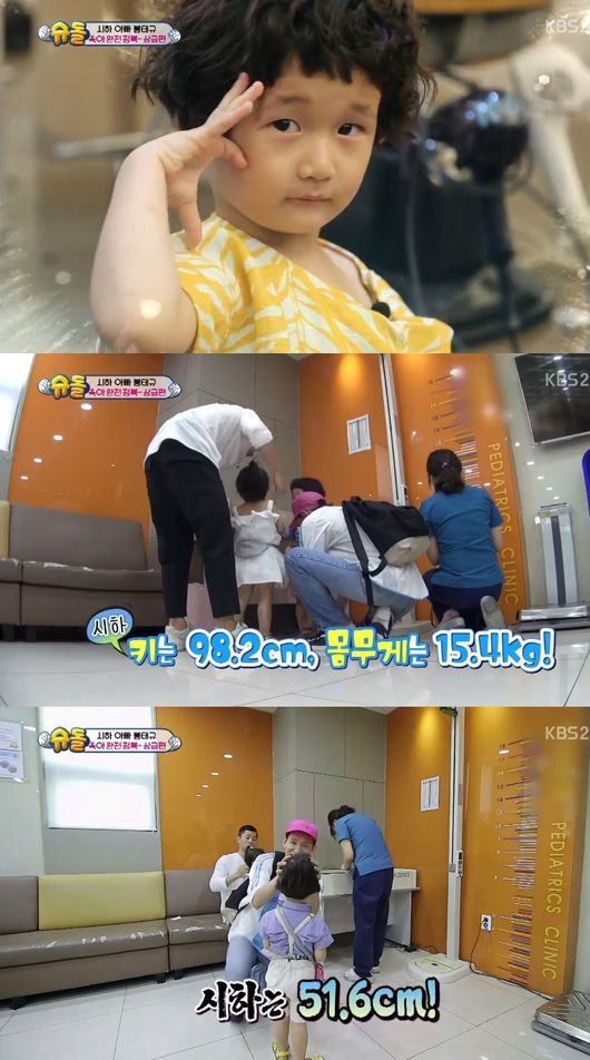 이어 예방접종을 위해 병원으로 향한 시하가 신체 사이즈를 잰 결과 키는 98.2cm, 몸무게는 15.4kg, 머리 둘레는 51.6cm으로 나왔다. 이에 의사는 “시하의 발달 상태가 좋다”고 칭찬했다./ purplish@osen.co.kr