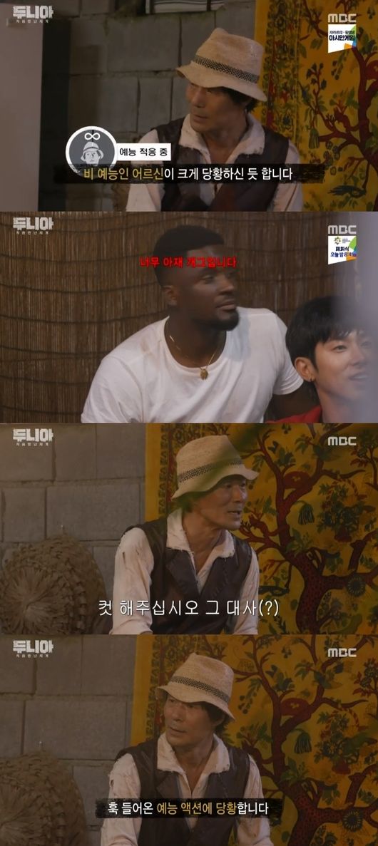 예능 초보 오광록은 '두니아'의 색다른 재미를 선사했다. '두니아' 자체가 언리얼 버라이어티인만큼, 실제와 가상을 오가며 방송이 진행된다. 예능 초보의 경우엔 어디까지가 진짜고 어디까지가 가상인지 알아채기 어려울 수 밖에 없다.