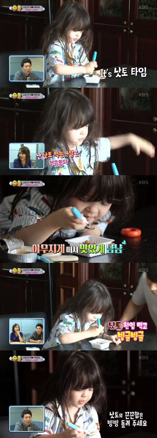 특히 나은은 낫또를 먹으며 낫또에서 나오는 끈적끈적한 실을 포크로 야무지게 휘젓는 모습이 놀라움을 자아냈다. 마치 어른들에게서나 볼 수 있는 장면을 4살 나은이 보여준 것.