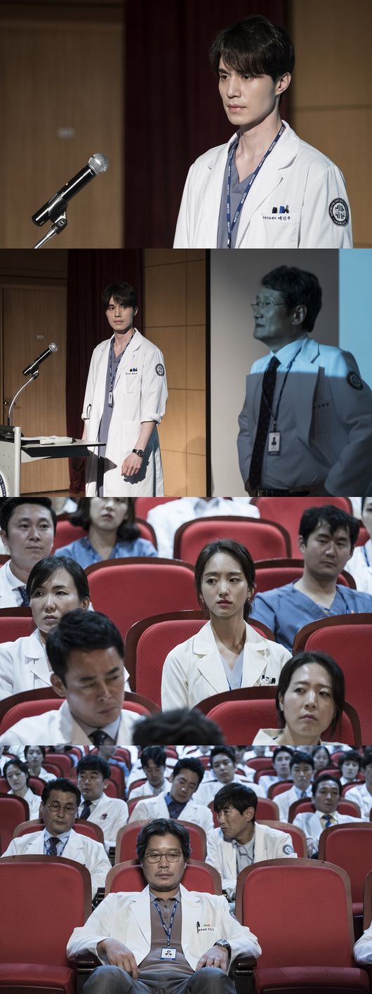 의료진 전원이 모인 총집결 현장은 상황의 엄중함을 드러내듯 심상치 않은 분위기가 감돈다. 병원 일에 직접 나서지 않았던 예진우지만 한층 단단해진 모습으로 단상에 올라 날카로운 눈빛의 담대한 카리스마를 발산하고 있다. 결의에 찬 주경문의 묵직한 존재감도 시선을 잡아끈다. 곳곳에서 보이는 의료진의 긴장감 넘치는 표정 속 이노을(원진아 분)의 굳은 표정도 궁금증을 자아낸다.