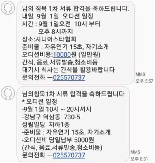 민지혁은 지난 1일 자신의 페이스북에 '님의 침묵' 측에서 보낸 문자 메시지 캡처본과 함께 장문의 글을 올렸다. 먼저 해당 문자에서는 '오디션 비용 1,0000원'이라는 글과 '오디션비 당일납부 5,000원'이라는 글이 눈에 띈다.