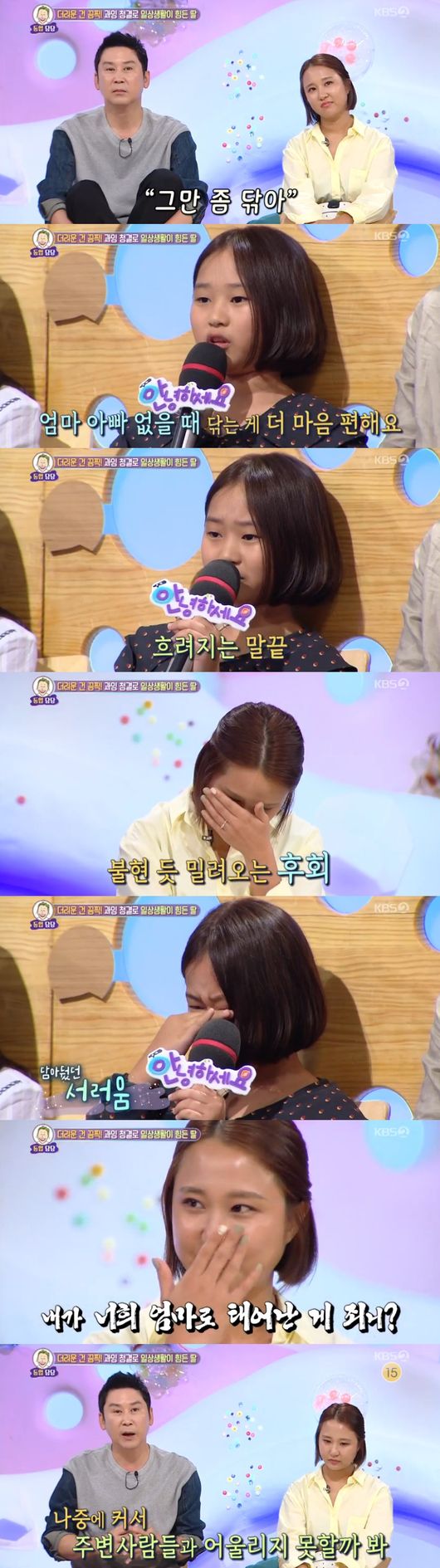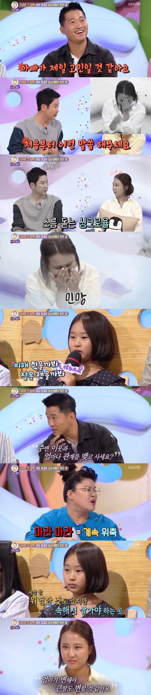 딸은 가장 서운한 말에 대해 "너 나, 스트레스 받게하려고 태어났지"란 말이라며 담아뒀던 서러움에 눈물을 흘렸다. 母는 감정에 못 이겨 울컥했다. 신동엽은 "나중에 커서 주변사람과 어울리지 못할까봐, 외톨이로 지낼까봐 걱정돼서 얘기하는 것"이라며 위로했다.