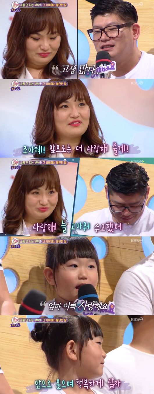 MC들은 "수고했다 애들 키우느라 힘들지 않냐는 말은 누가 먼저하는게 중요하지 않다"면서 가장 필요한건 따뜻한 말 한마디라고. 부부 소통이 딸의 행복을 찾아줄 유일한 방법이라 했다. 그제서야 두 사람은 "애들키우느라 고생많고, 진심으로 미안하다, 앞으로 더 사랑하겠다"고 약속했고, 간절히 바람이었던 부모님 다정한 모습에 딸은 "우주만큼 좋다"며 잃었던 미소를 되찾았다.