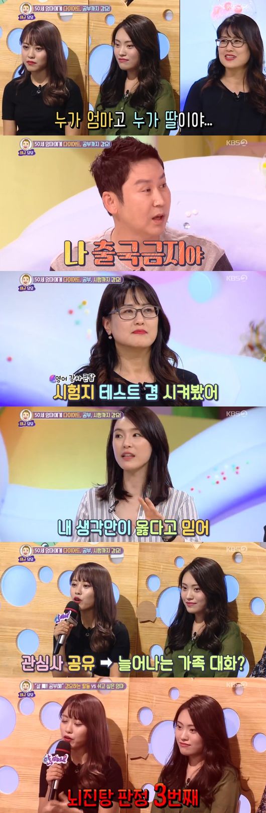 게다가 공부 잔소리도 계속된다고 했다. 영어는 물론 스페인어와 일본어도 추가했다고. 딸들은 수학선생님인 母를 위해 외국어를 배우게 한 건 치매예방이라 추천했다고 했다. 다이어트 운동에 인터넷 강의 공부는 물론, 직독직해 문제로 시험까지 본다고했다. 영어강사인 큰 딸이 엄마를 위해 매주 시험을 보게 해서 테스트지를 만들게 됐다고 했다. 딸은 관심사를 공유해야 가족간의 대화가 된다고 했다.