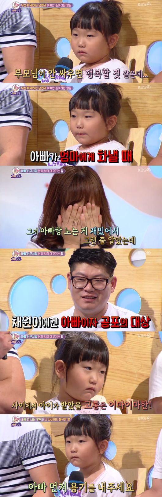 이때, 어린 딸의 충격적인 고백이 이어졌다. 부모님 안싸워야 행복하다는 말에 딸은 "아빠 무서울 때 있다, 엄마에게 화낼 때"라면서 아빠에게 혼나는 것이 무서워서 더 애교를 부리는 것이라 했다. 충격적인 딸의 진심에 모두 경악했다. 화나면 무서운 아빠는 공포의 대상이었던 것이다. 아빠랑 노는게 재밌어서가 아닌, 화난 모습이 두려워서 선택한 어린 딸의 방법이었다. 처음 알게된 채원이 진심에 가슴에 무너저 내린 듯 제보자는 눈물 흘렸다.