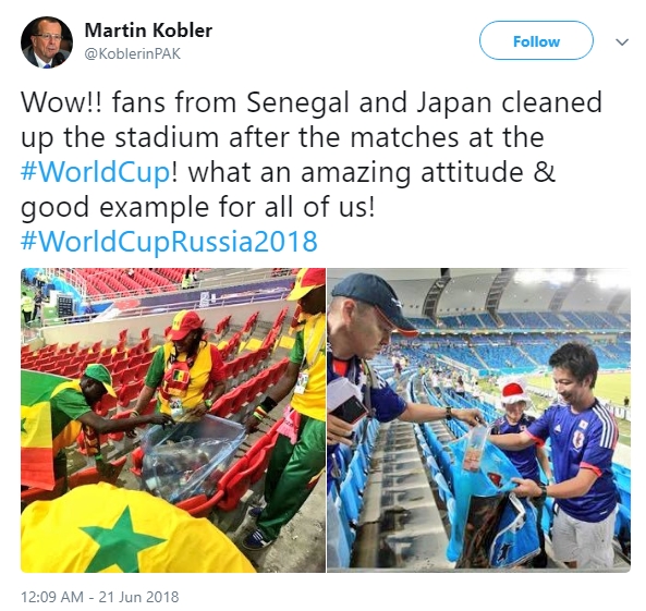 일본 팬들은 지난 6월 19일 콜롬비아와의 조별리그 1차전에서 2-1로 승리한 후 경기장을 말끔하게 마무리하고 떠났다. 같은 H조의 세네갈 팬들은 다음날인 20일 폴란드를 2-1로 제압한 뒤 뒷정리하는 모습이 포착됐다.